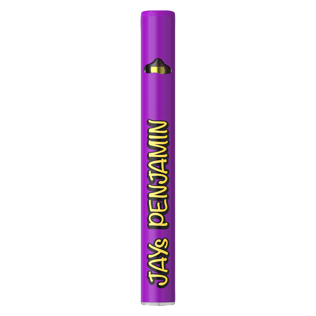 Jays presents potent products full of flavour in convenient formats. Get ready to meet the Penjamin, our convenient signature pen style device bursting with flavour and THC. Formulated with high purity, high potency distillate, it features the rich fruity flavours of purple grape with an exhale of rich myrcene. This device is portable and filled with expertly formulated quality THC distillate.